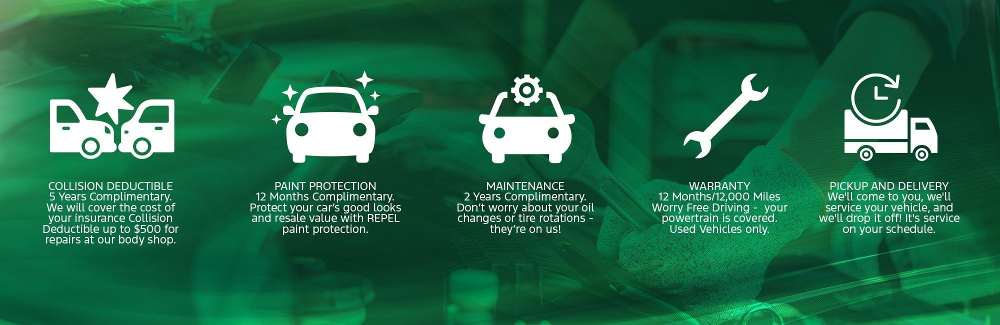 - Five Years of Collision Deductible Coverage - We'll pay your insurance deductible in the event of a collision, saving you from unexpected expenses.